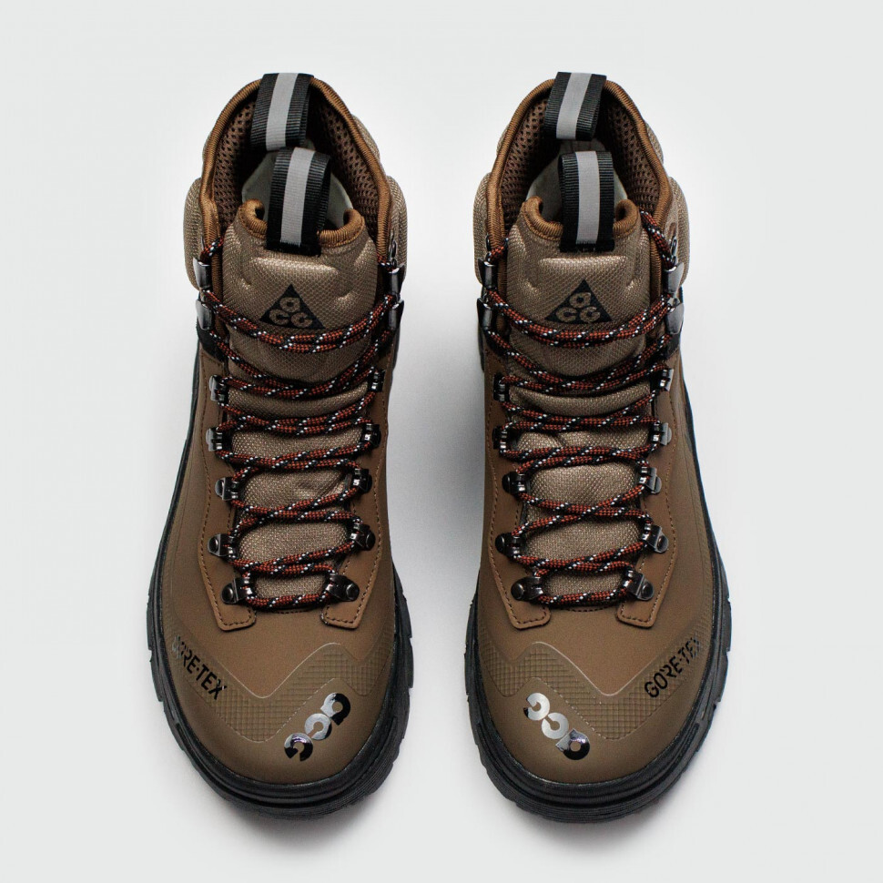 Высокие ботинки ACG Zoom Gaiadome GTX Brown / Black имеют минималистичный дизайн, но очень прочную всепогодную конструкцию. Воротник на щиколотке имеет мягкую подушку, а язычок и верхняя часть выполнены из долговечного материала GORE-TEX. Обувь оснащена веревочными шнурками, которые проходят через металлические проушины и крючки.