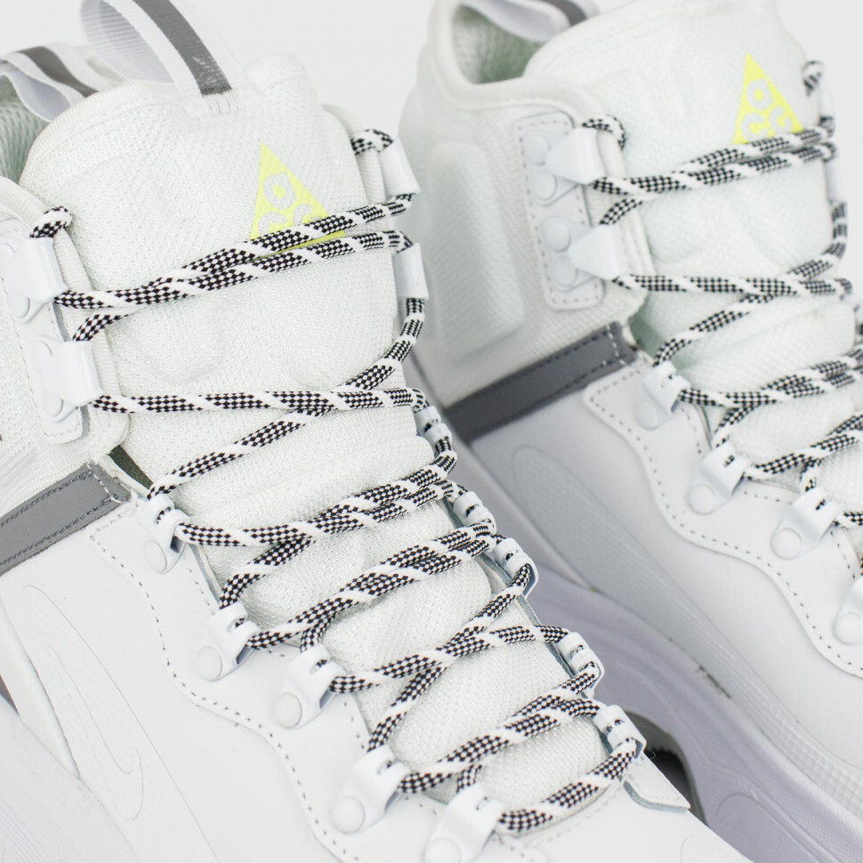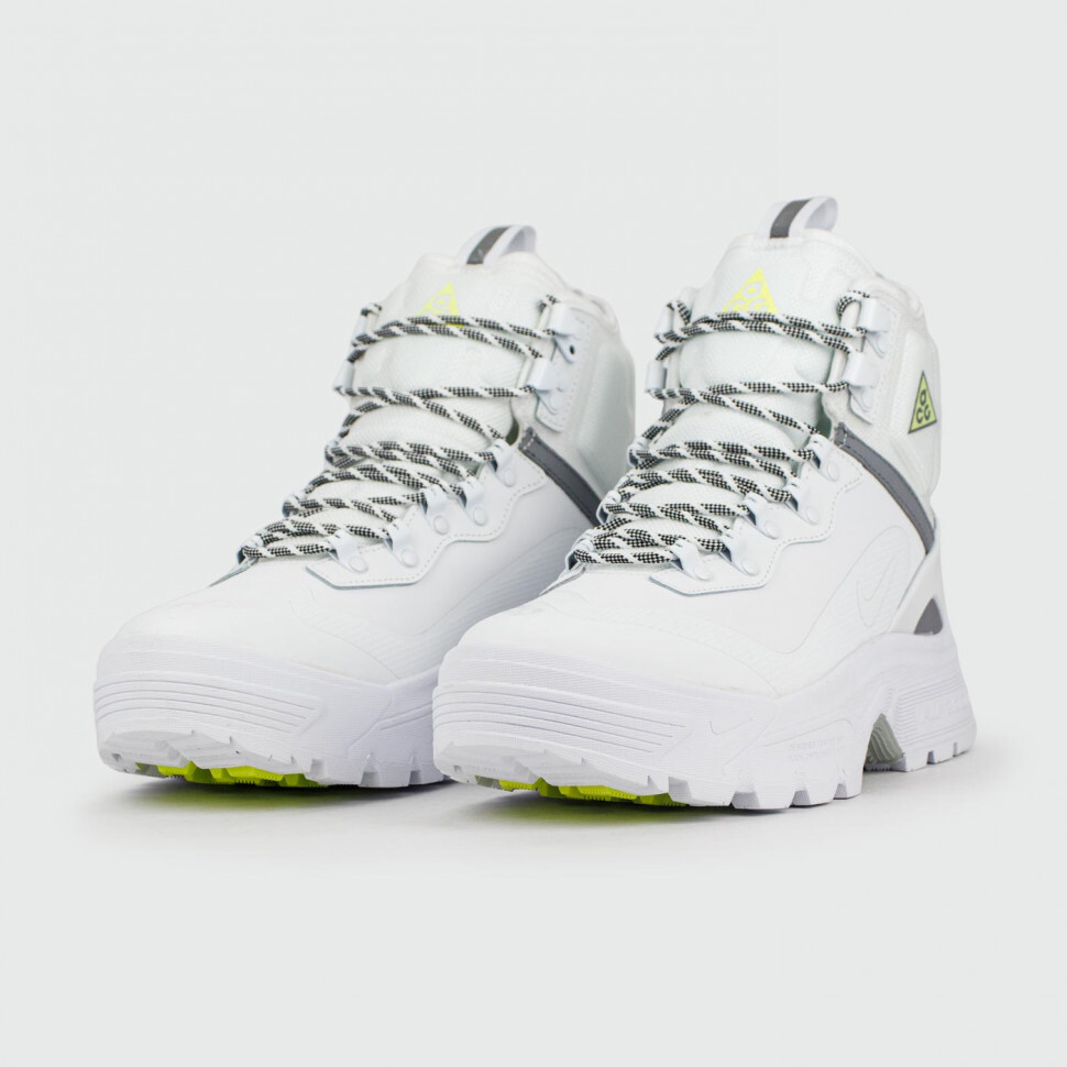 Высокие ботинки ACG Zoom Gaiadome GTX White имеют минималистичный дизайн, но очень прочную всепогодную конструкцию. Воротник на щиколотке имеет мягкую подушку, а язычок и верхняя часть выполнены из долговечного материала GORE-TEX. Обувь оснащена веревочными шнурками, которые проходят через металлические проушины и крючки.