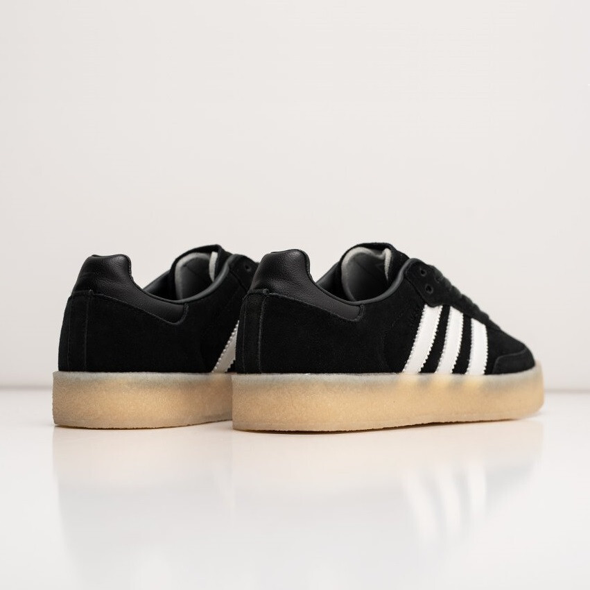 Пары имеют традиционный верх силуэта Samba с переосмысленным замшевым верхом от Clarks. Каждый из логотипов брендов выбит на язычке, а культовая креповая подошва Clarks завершает дизайн..