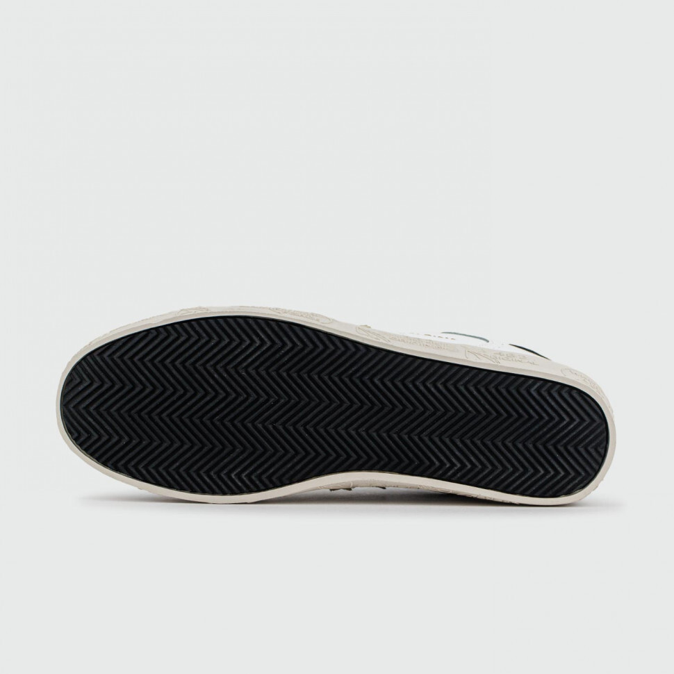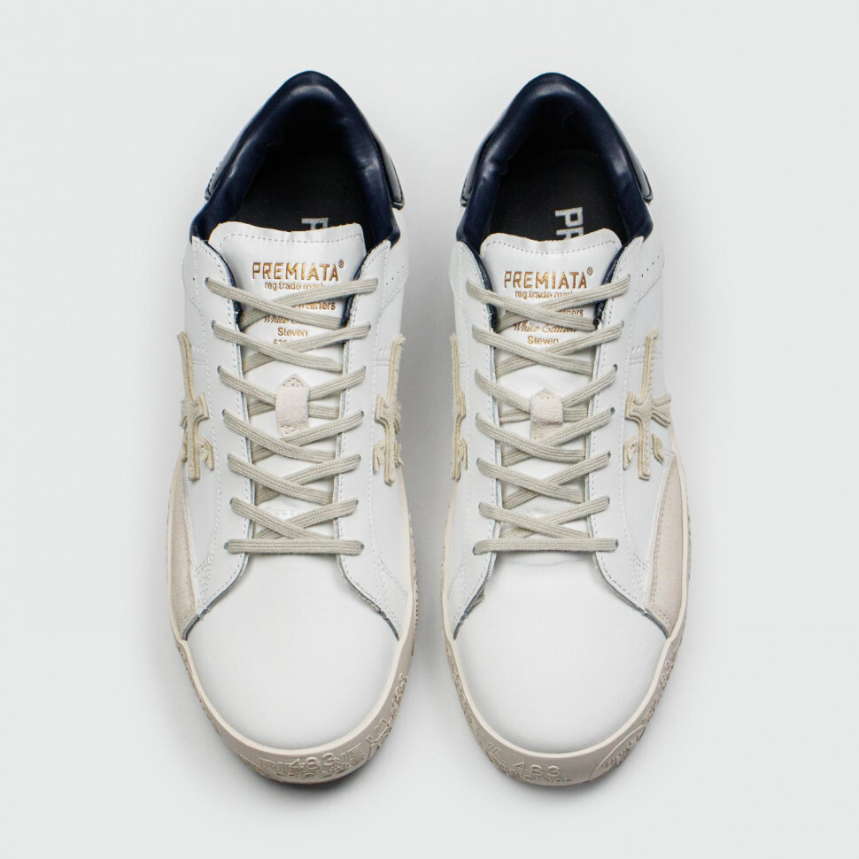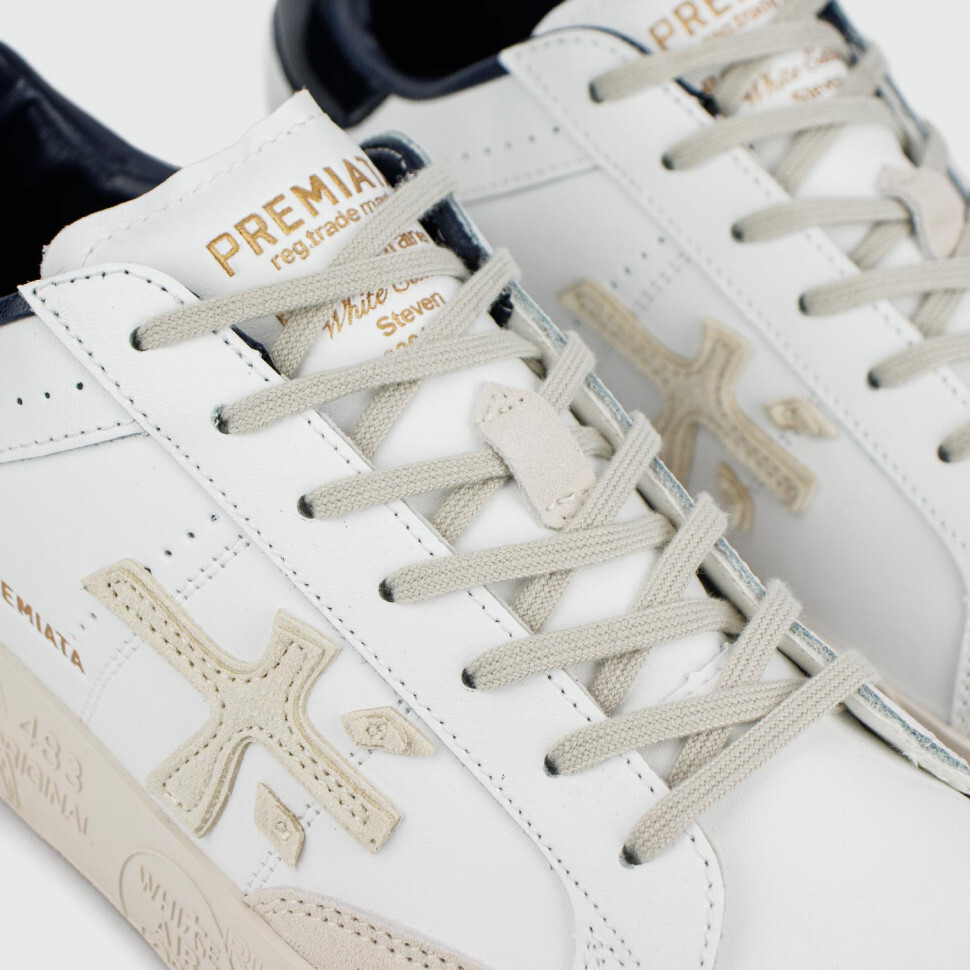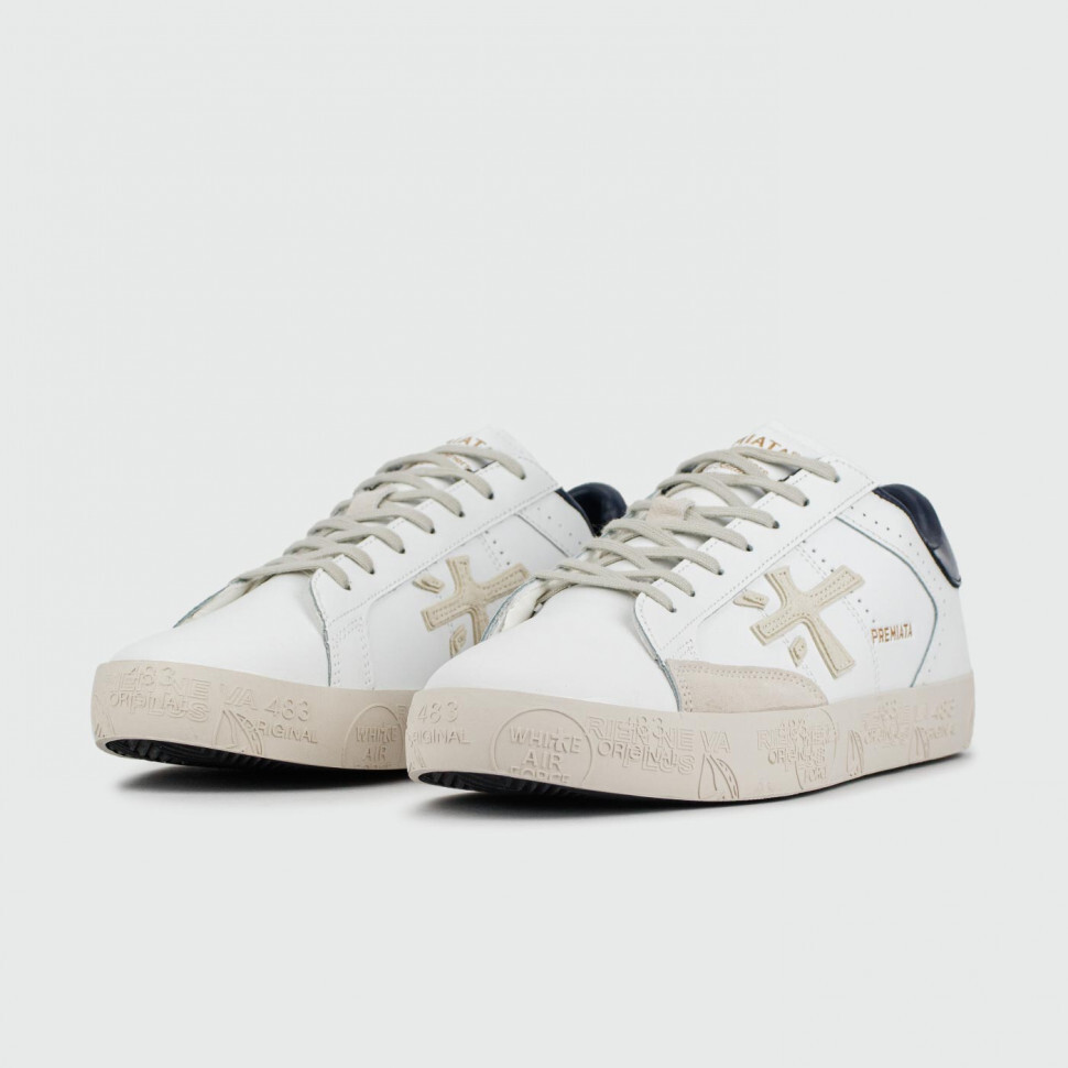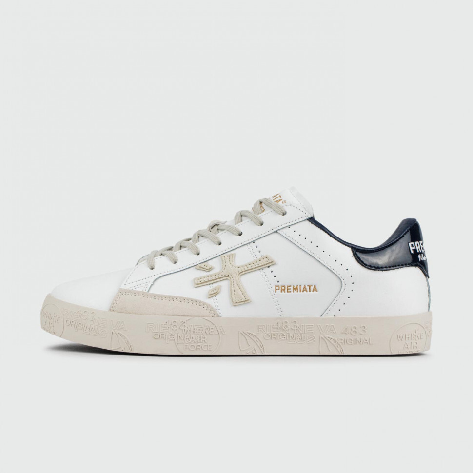 Кеды от итальянского бренда Premiata, о чем говорит логотип сбоку и штампы на подошве. Пара выполнена из иск.кожи и имеет небольшие вставки из замши. Черный лакированный задник создаёт контраст белому фону.