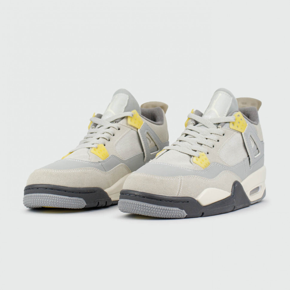 Кроссовки выполнены из микса иск.кожи, замши и текстиля. Сверху видим также полупрозрачные желтоватые проушины. Дизайн завершает белая межподошва и серая аутсоль.