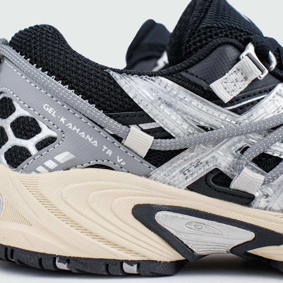Беговые кроссовки черно-серого цвета Asics Gel-Kahana TR V2. Верх из дышащей и эластичной сетки, уникальная дополнительная шнуровка и накладка на пятке DuoMax значительно улучшают фиксацию ноги. Оригинальная технология Rearfoot GEL гарантирует удобство обуви и ее отличную амортизацию, подошва из абразивной износостойкой резины с протектором улья чешуя».