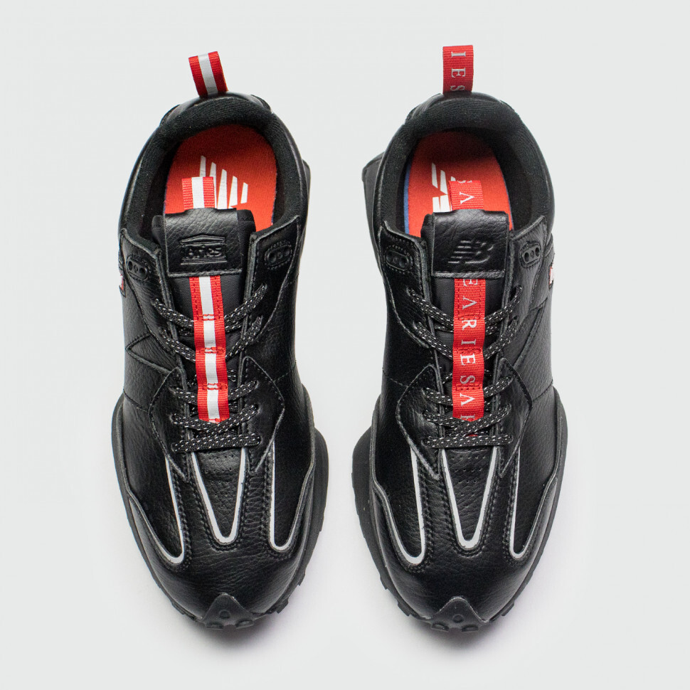 За основу был взят силуэт New Balance 327. Верхняя часть кроссовок изготовлена из кожи и установлена на мягкую подошву из EVA с резиновой подметкой. Модель получила полностью монохромное цветовое решение, которое компенсируются светоотражающими полосами в районе носка и пятки. В качестве ярких акцентов использованы красные петельки на язычках и задниках, а также логотип Aries поверх буквы “N” c внешней стороны.