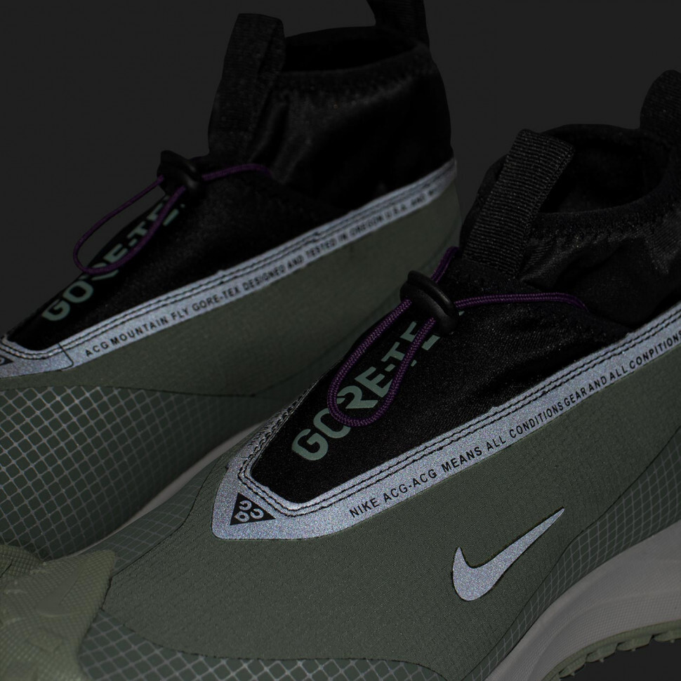Кроссовки Nike ACG Mountain Fly GTX Clay Green — прочная обувь для активного отдыха, готовая к любым непогодам. Фиолетовый шнурок фиксирует зеленый текстильный верх из рипстопа с подкладкой из водонепроницаемого материала Gore-Tex и оснащен эластичной крокодиловой фиксацией на щиколотке для поддержки посадки. Двойные язычки позволяют легко надевать и снимать. Легкая конструкция установлена на плюшевой промежуточной подошве, которая сочетает пеноматериал Nike React с технологией Vaporfly для плавного хода. Подошва из липкой резины с выступами обеспечивает сцепление на бездорожье.
