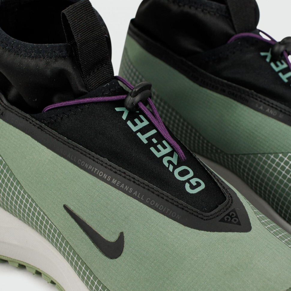 Кроссовки Nike ACG Mountain Fly GTX Clay Green — прочная обувь для активного отдыха, готовая к любым непогодам. Фиолетовый шнурок фиксирует зеленый текстильный верх из рипстопа с подкладкой из водонепроницаемого материала Gore-Tex и оснащен эластичной крокодиловой фиксацией на щиколотке для поддержки посадки. Двойные язычки позволяют легко надевать и снимать. Легкая конструкция установлена на плюшевой промежуточной подошве, которая сочетает пеноматериал Nike React с технологией Vaporfly для плавного хода. Подошва из липкой резины с выступами обеспечивает сцепление на бездорожье.