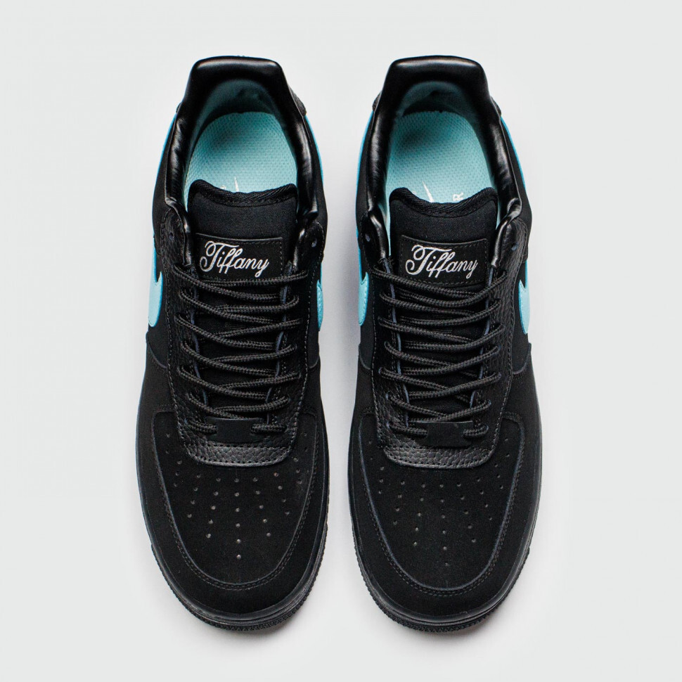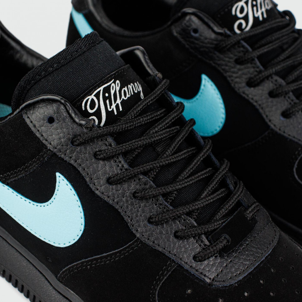 Модель называется Air Force 1 x Tiffany 1837 - в честь года основания Tiffany & Co. - верхняя часть из черной замши украшена нежно-голубым свушем. На язычке разместилась надпись "Tiffany" и на пятке в виде серебряной детали с совместным брендингом.