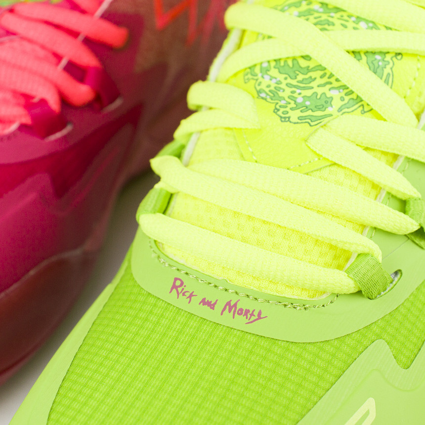 Как уже стало понятно, это полноценная коллаборация Rick And Morty x Puma. Название мультфильма расположится на начале шнуровки. Левый кроссовок - зеленый с желтыми деталями. Правый - красный с оранжевыми. На язычках появился рисунок в виде портала. Самое интересное нас ждет внутри язычков, там можно встретить главных персонажей мультфильма - Рика и Морти.